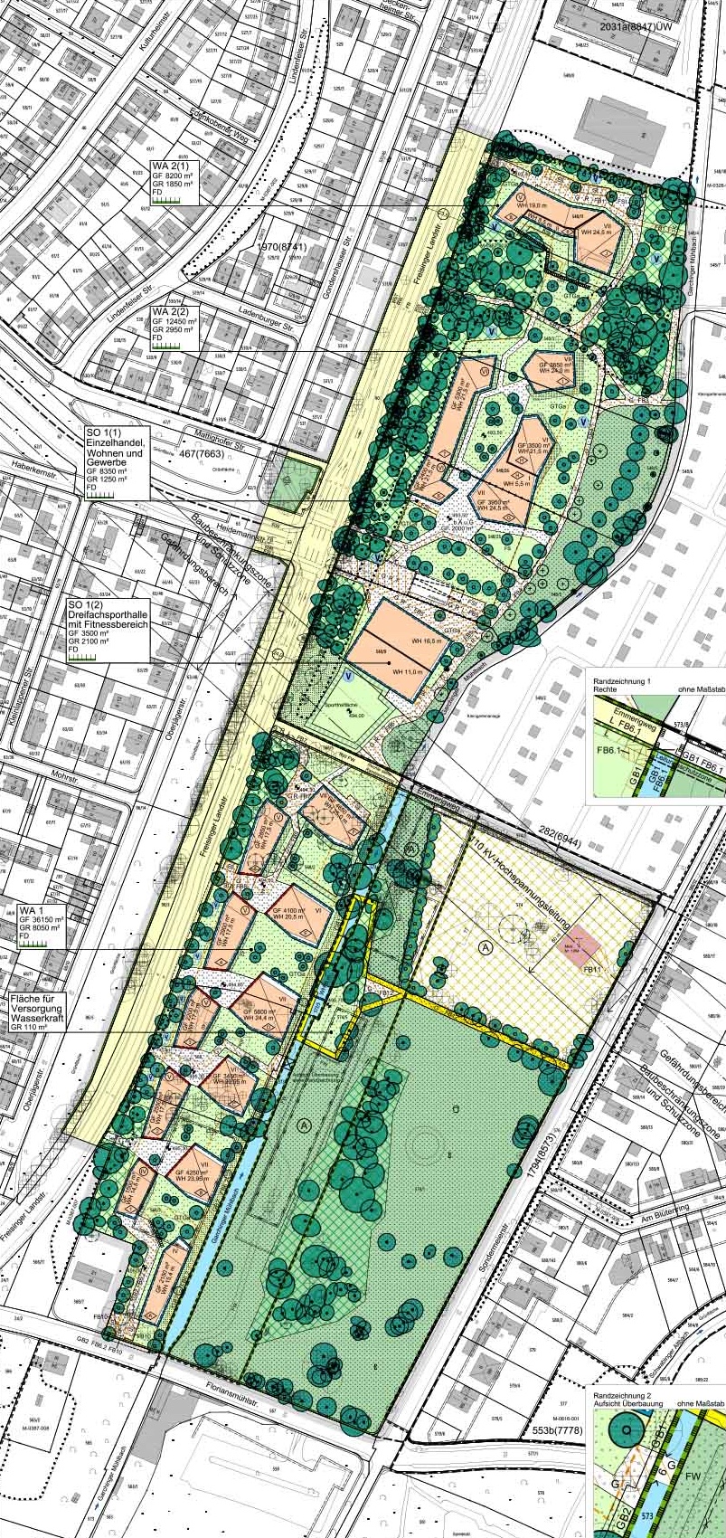 Das Siegerkonzept aus dem städtebaulichen und landschaftsplanerischen Wettbewerb mit ergänzendem Plangutachten (Machbarkeitsstudie) (siehe Abbildung unten) wurde dem Bebauungsplan mit Grünordnung zugrunde gelegt. Neben den Grün- und Parkflächen werden zwischen Bachlauf und Freisinger Landstraße ein Wohngebiet für ca. 600 Wohneinheiten mit Kindertagesstätten, Nahversorgungs-, Gewerbe- und Gastronomienutzungen sowie eine Sporthalle mit Freigelände festgesetzt. Ebenso wird das bestehende Wasserkraftwerk erhalten.