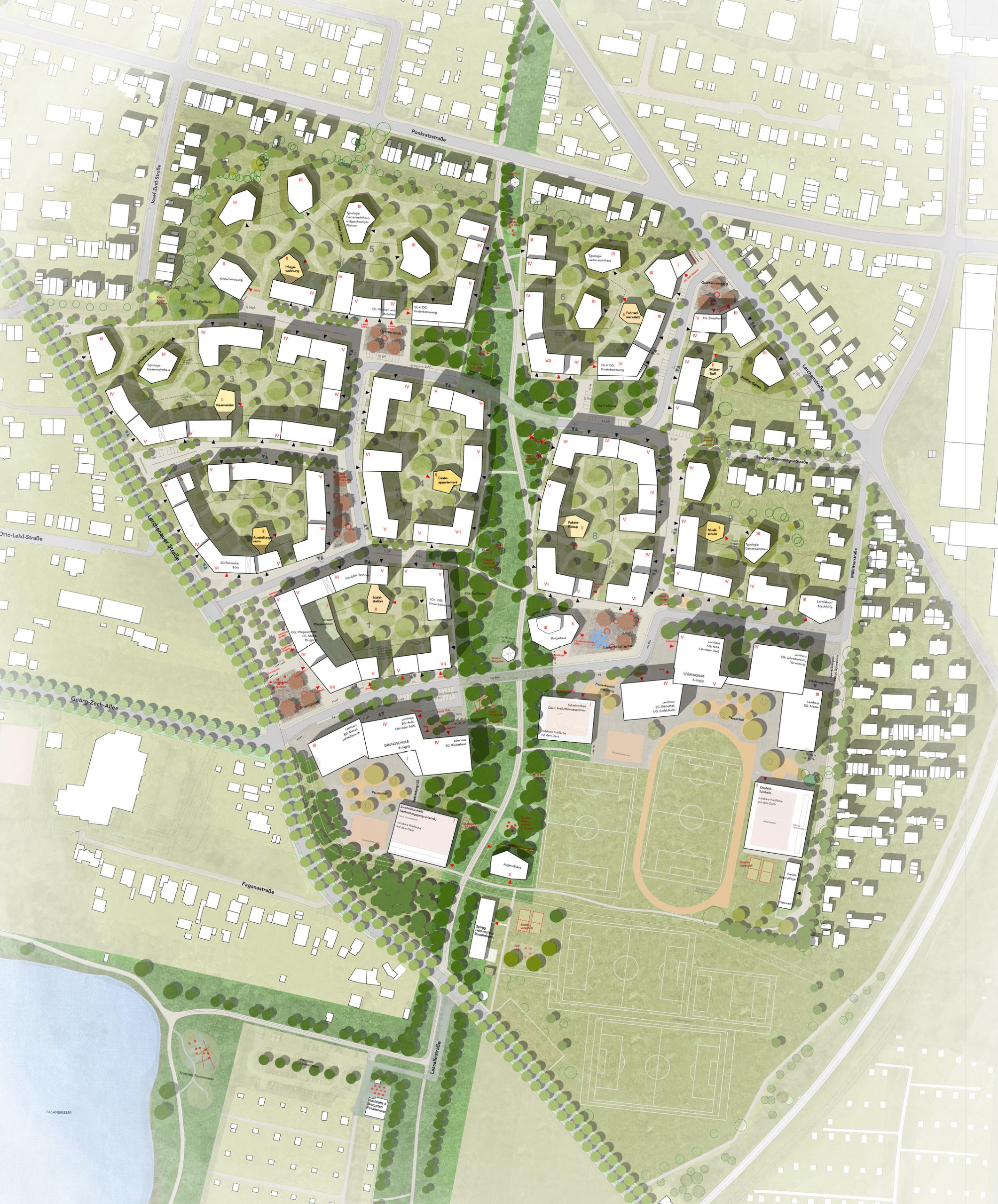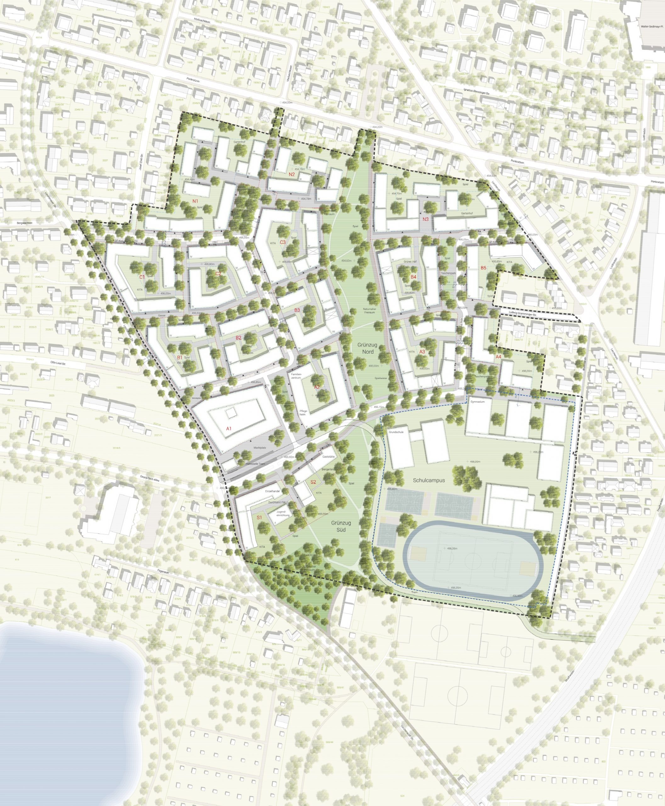 Nach der Teilnahme am Wettbewerb und dem erreichten 3. Preis erhielten wir den Auftrag, auf Basis des 1. Preises sowie einer Volumenstudie für den Schulcampus das Bebauungsplanverfahren zu betreuen.