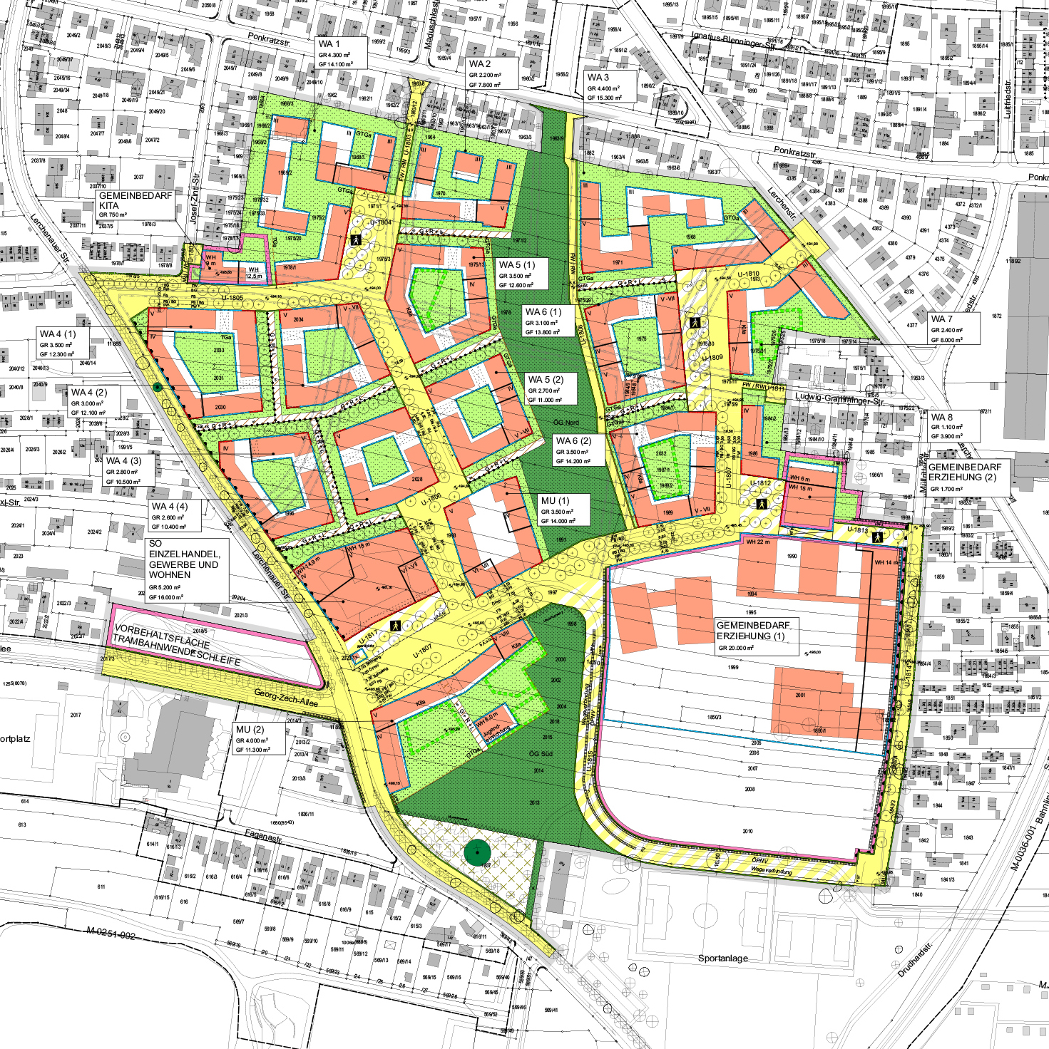 Im Stadtteil Feldmoching entsteht ein urbanes, verdichtetes Stadtquartier mit Geschosswohnungs-bauten und den zugehörigen Infrastruktureinrichtungen. Im südwestlichen Bereich des Planungsgebiets ist am „Marktplatz“ ein Quartierszentrum vorgesehen mit Einkaufsmöglichkeiten, Gewerbe und sozialen Infrastruktureinrichtungen. Südöstlich schließt der neue Bildungscampus an, dessen Außensportflächen im Süden an die bestehenden Sportanlagen anbinden. Nördlich und nordöstlich des Marktplatzes entwickeln sich beiderseits eines Nord-Süd-Grünzugs Blockrandbebauungen im eher kleinstädtischen Maßstab mit moderater Höherentwicklung um geschützte Wohnhöfe herum. Diese werden im Übergang zur bestehenden Wohnbebauung im Norden kleinteiliger und niedriger. Das Planungskonzept ermögliclht neben einer moderaten städtebaulichen Entwicklung die Umsetzung der „Modellstadt 2030“ der Inzellinitiative sowie ein ambitioniertes Mobilitätskonzept mit einem Anteil von max. 20 % motorisierten Individualverkehrs (MIV). Darüber hinaus wurde ein innovatives, lokales, weitgehend regeneratives Energiekonzept in Zusammenarbeit mit der Stadtwerke München GmbH erarbeitet und die Voraussetzungen zum Ausbau der Trambahn sowie des Radwegenetzes initiiert.