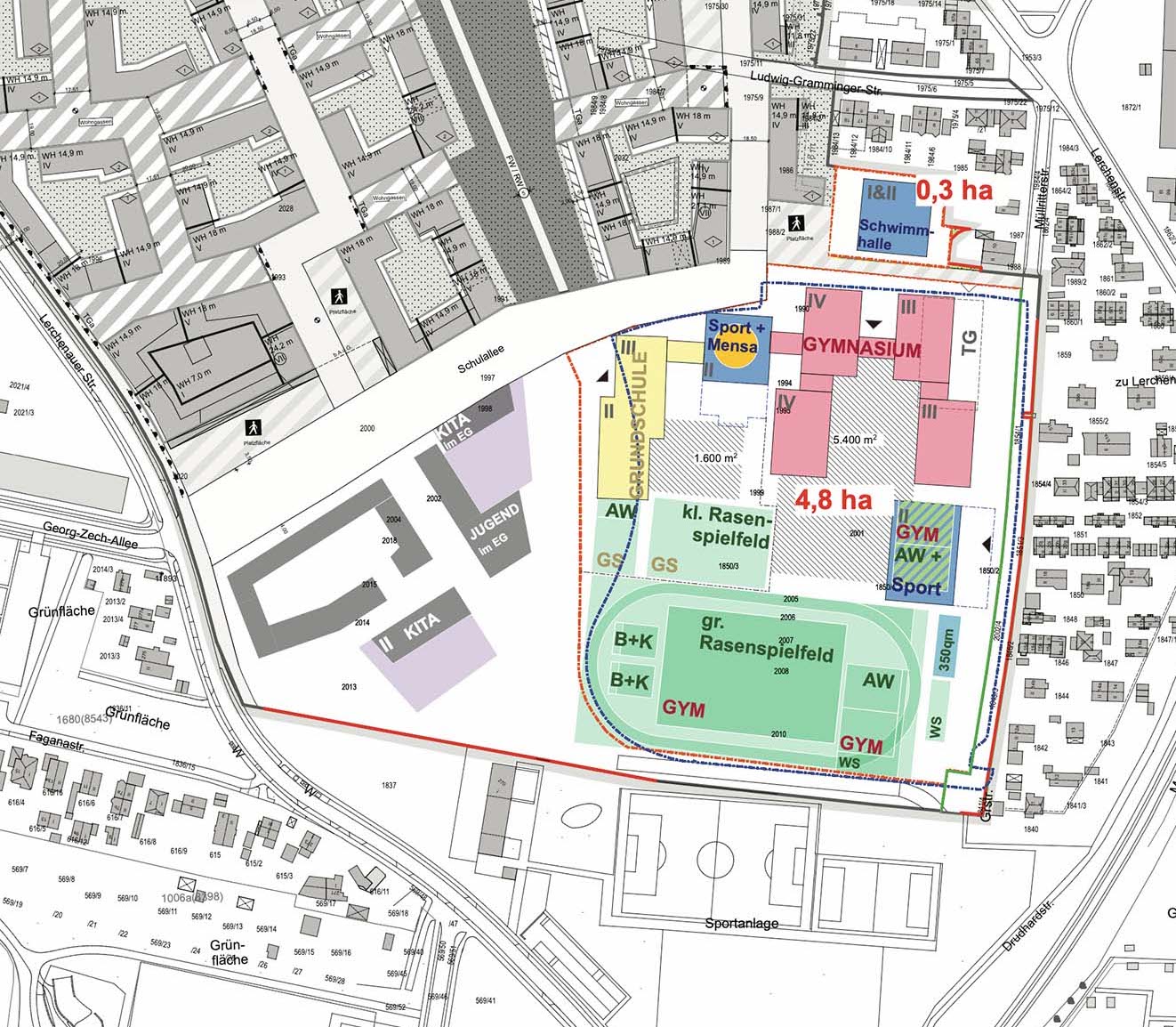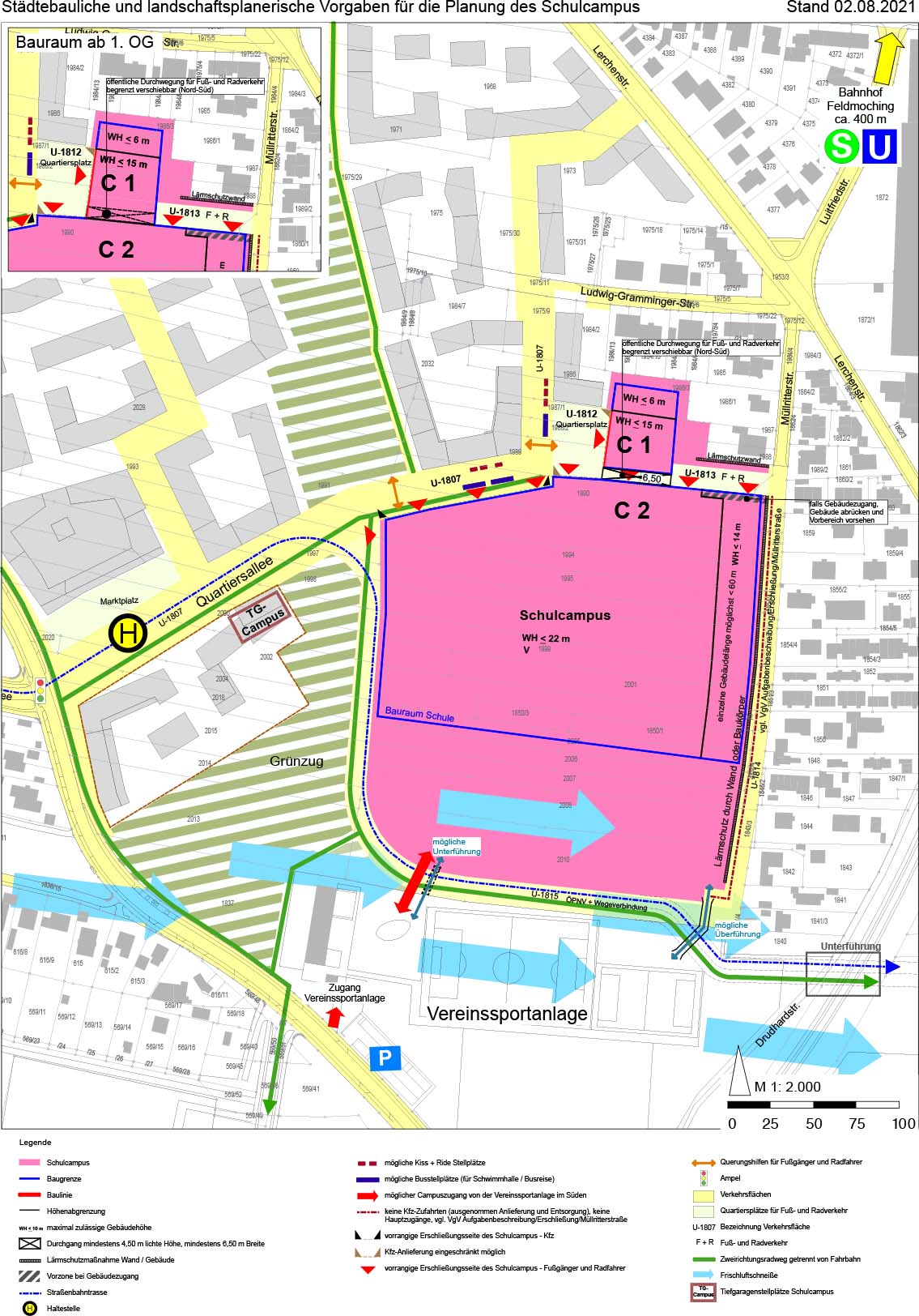 Die Studie beschränkt sich auf den Schulcampus und die hierfür erforderlichen Grundstücke. Sie macht keine Planungsaussagen zur Nutzung gegebenenfalls frei- werdender Flächen und angrenzender öffentlicher Grün-und Verkehrsflächen. Für eine bessere Orientierung und Beurteilbarkeit der Planungsüberlegungen für den Schulcampus zeigt sie für das Umfeld jedoch Überlegungen zur Nutzungsverteilungen in skizzenhafte Darstellung.