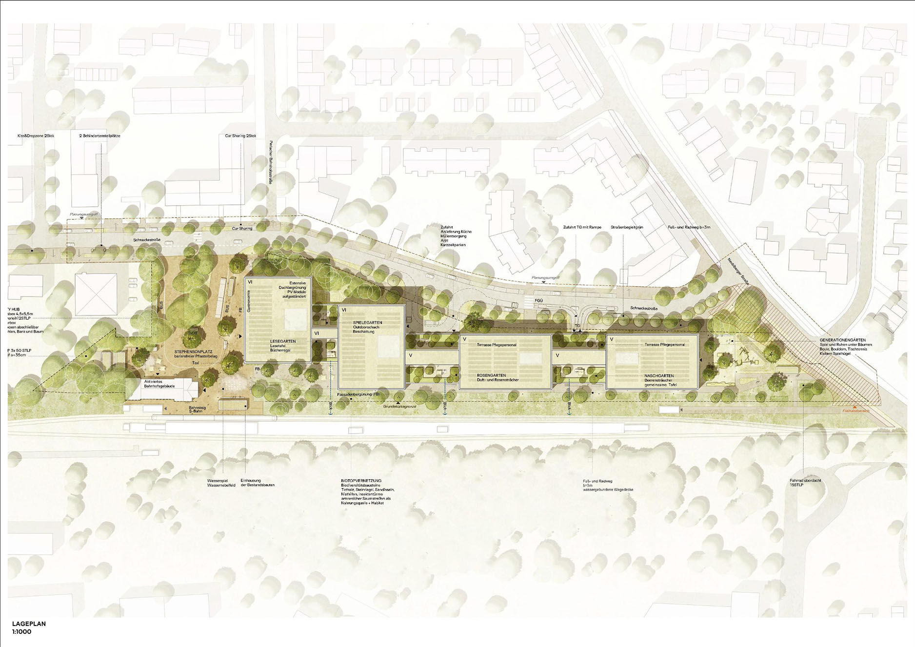 Auf einem ca. 2 ha großen ehemals bahngewidmeten Areal am Bahnhof Perlach soll eine moderne Seniorenwohn- und Pflegeanlage entstehen. Das Raumprogramm umfasst ca. 300 Pflegeappartements und eine Pflegestation mit ca. 60 Betten mit zugehöriger medizinischer und physiotherapeutischer Infrastruktur sowie gewerblichen Dienstleistungsnutzungen, Gemeinschaftseinrichtungen und einem öffentlich zugänglichen Restaurant. Für die Bewohner*innen, Besucher*innen und Mitarbeiter*innen sollen attraktive und hochwertig gestaltete Freiflächen unter Berücksichtigung des erhaltenswerten Baumbestandes sowie von Lärmschutzanforderungen geschaffen werden. Der Stephensonplatz soll als urbaner öffentlicher Raum gestalterisch und funktional als Halte- und Umsteigepunkt für den öffentlichen Verkehr mit verschiedenen Mobilitätsangeboten aufgewertet werden.