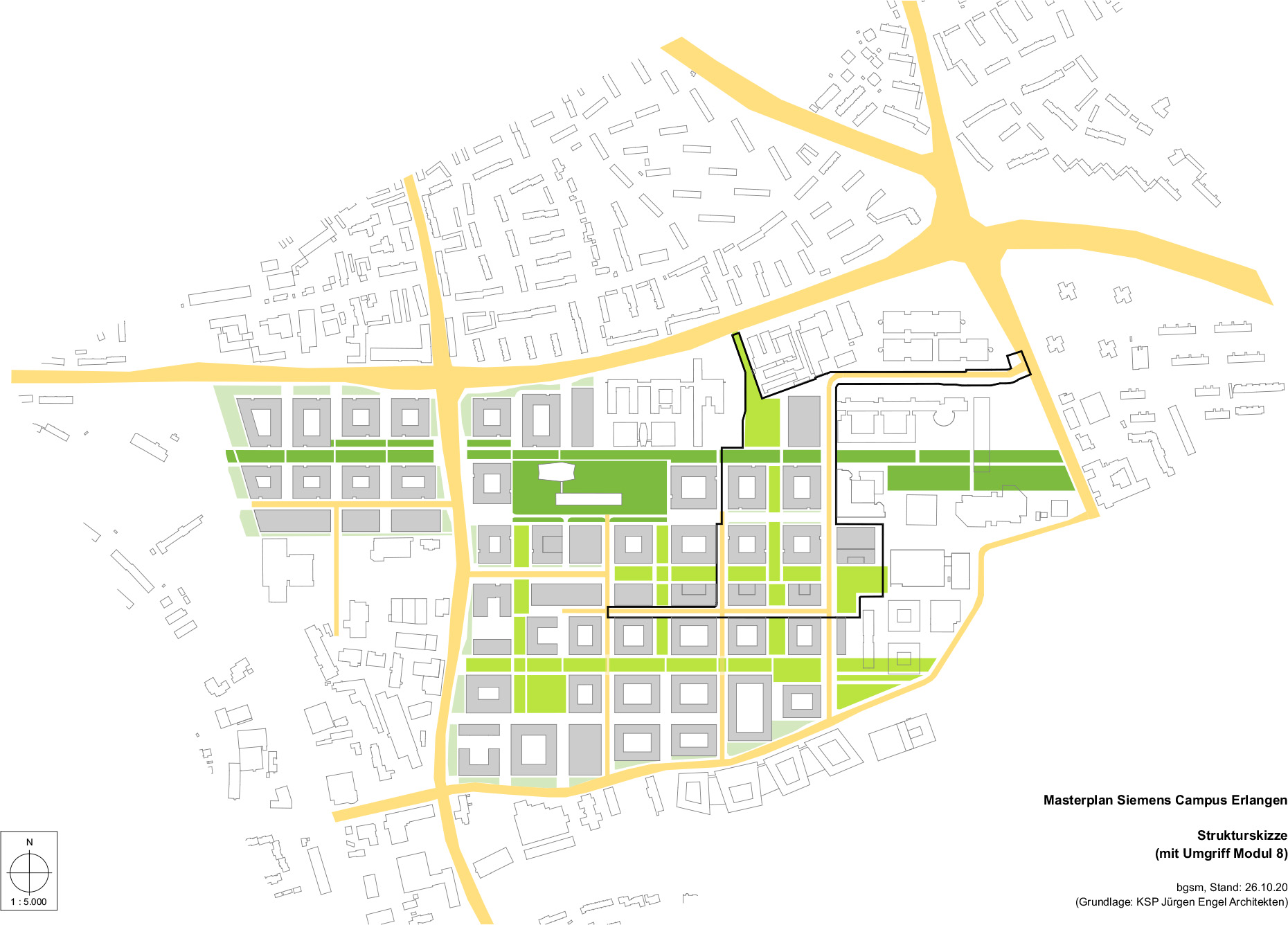 Siemens errichtet auf seinem weltweit größten Standort einen offenen, modernen und nachhaltig gestalteten Campus. Aufbauend auf einem in einem Wettbewerbsverfahren gekürten städtebaulichen und landschaftsplanerischen Masterplan soll das ca. 54 ha große Planungsgebiet abschnittsweise in Modulen mit Größen von ca. 6-10 ha entwickelt. Der Masterplan bildet dabei die Grundlage für die Bauleitplanung. Die einzelnen Bebauungspläne (Module) sichern das städtebauliche und landschaftsplanerische Entwurfskonzept und regeln die gewünschten Nutzungen. Dabei wird der ruhende Verkehr in zentralen Parkhäusern organisiert, um eine möglichst hohe Freiflächenqualität im Gebiet zu erhalten. Ein wesentliches Element des Masterplans ist daher die Grünachse, die sich über mehrere Module erstreckt. Sie erfährt im Westen an der S-Bahn-Station Paul-Gossen-Straße ihren Auftakt und stellt die wesentliche Durchwegung für Fußgänger und Radfahrer von West nach Ost über den gesamten Campus bis zum Naturschutzgebiet der Brucker Lache dar.