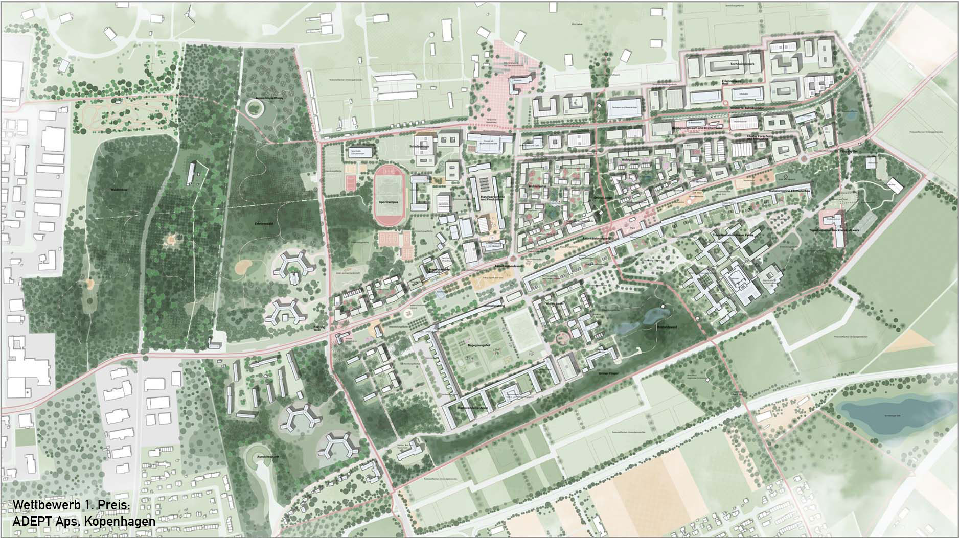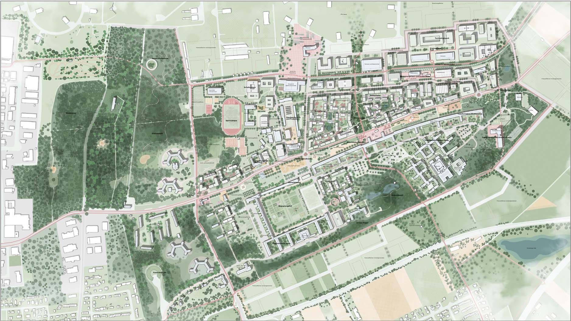 Besondere Herausforderungen waren dabei die Überwindung der isolierten Insellage des Areals und die Verknüpfung mit der Kernstadt sowie die Integration großflächiger denkmalgeschützer Strukturen im Wettbewerbsgebiet.