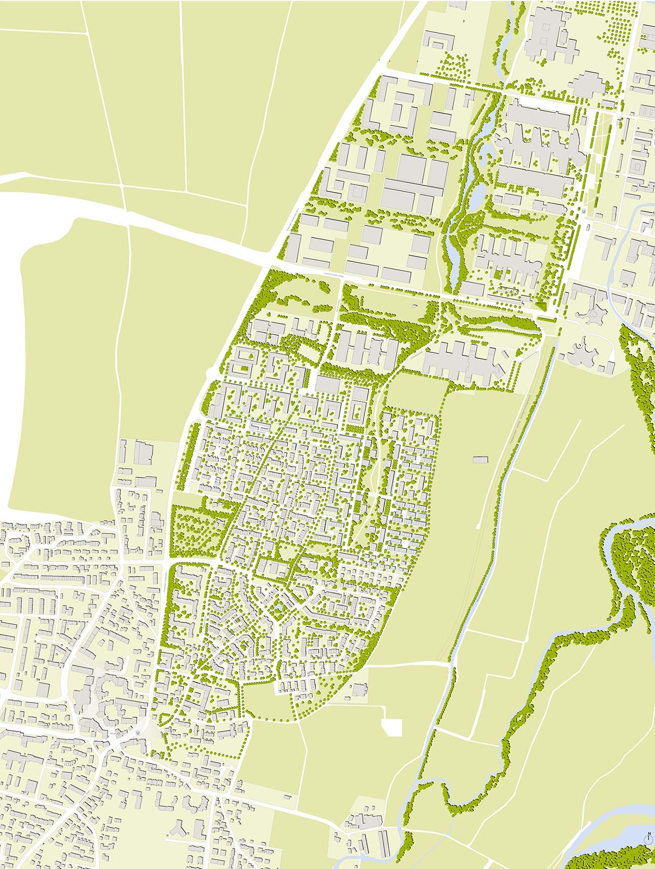 Unser Wettbewerbskonzept entwickelt sich nahezu übergangslos aus der vorhandenen Siedlungsstruktur. Es entstehen zwei unterschiedliche Zonen. Der Boulevard im Norden bildet die Schnittstelle zwischen Stadt und Hochschul-Campus. Hier reihen sich die öffentlichen Infrastruktur-Einrichtungen, Grundschule und Sport- bzw. Freizeiteinrichtungen auf. Im Osten durchzieht ein „Grüner Anger“ die neuen Wohngebiete. Offene Zeilen- und Punkthäuser bieten Wohnen im Grünen als besondere Qualität an.