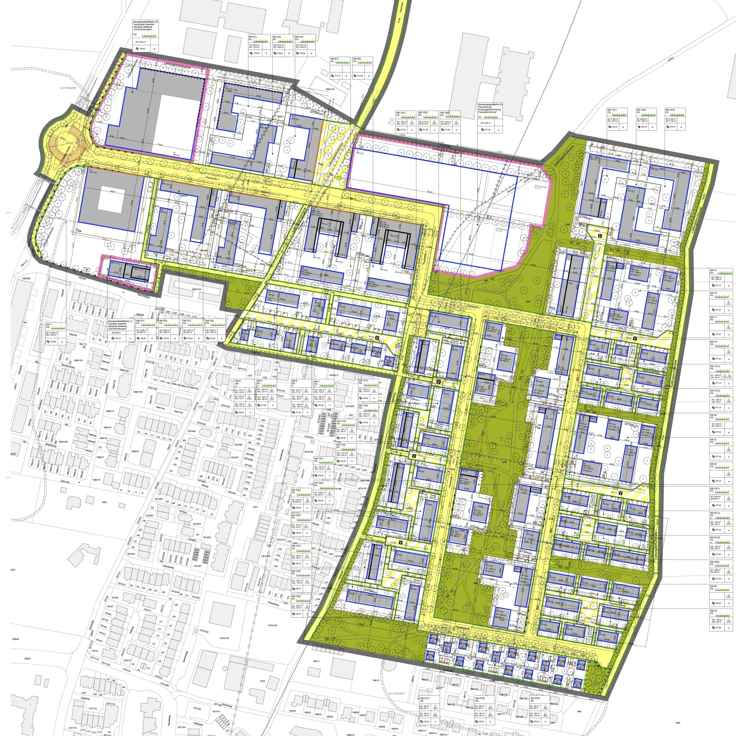 Auf der Grundlage des prämierten Wettbewerbsentwurfes erstellten wir den Bebauungsplan für das 31 ha große Gebiet der Kommunikationszone. Verbunden damit war eine intensive Auseinandersetzung mit den Themen Stellplatzreduktion aufgrund eines Mobilitätskonzeptes sowie Regenwassermanagement.