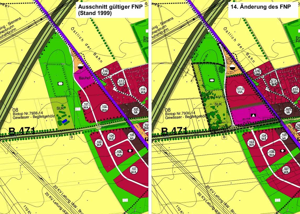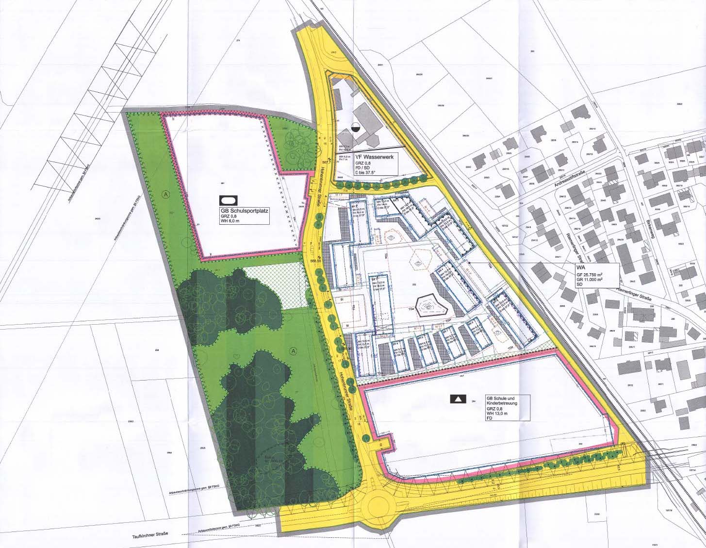 Unser Büro erstellte den Bebauungsplan für das ca. 14 ha große Areal mit Gemeinbedarfsflächen für eine Realschule mit Freisportflächen, einem Wohngebiet mit ca. 250 Wohneinheiten und einer Versorgungsfläche Wasserwerk.