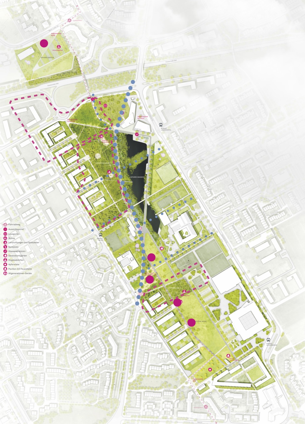 Unser Büro erstellte auf der Grundlage des prämierten Wettbewerbsentwurfs der Planungsgemeinschaft Zwischenräume Architekten + Stadtplaner GmbH, Weihs Landschaftsarchitektur und Transver GmbH Verkehrsplanung den Bebauungsplan für das 48 ha große Areal.